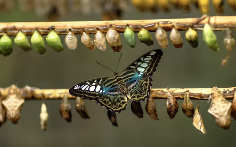 What is the process of becoming? I experience it as a fluid process: one state changing into another. When we mention the word transformation the butterfly is the first symbol to appear. Is it because the change that the caterpillar goes through is so drastically different than its original form? It is clearly the most noticeable visually. The Oxford dictionary defines transformation as: a thorough or dramatic change in form or appearance. Surely the butterfly is a fine example. Miriam Webster says it differently. The first definition is an act, process, or instance of transforming or being transformed. I prefer this definition even though it does the unsettling thing of using a form of the word itself as part of the definition—always somewhat disconcerting. Perhaps the simplest definition might be transformation is the process of changing. This is the closest to what I mean when I say Transformation is Becoming. In my Model for Radical Resilience transformation is the fourth stage directly following Grow. An illustration of the four stages follows: